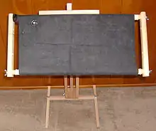 Three basic methods may be used to embroider with beads: individual beads may be sewn directly onto fabric, or several beads may be run through a needle before running through the backing, or else a line of threaded beads may be laid upon a fabric and secured with couching stitches.[3] Many people use a needle and thread to stitch beads to the fabric, usually a fine needle with a small eye to facilitate easier passage through the small holes in many seed beads, a second technique uses a fine hook to chain stitch thread to the fabric, in Europe this technique is known as Tambour[4] or Luneville[5] embroidery, and is commonly used to bead haute couture garments. In India the work is called Zari or Moochi Aari,[6] or just Aari [7] and is used on garments and furnishings. A hallmark of Tambour or Luneville embroidery is that the beads are attached on the underside of the fabric and the chain is formed on the top side of the fabric. Whereas in Zari and Aari work the beads are attached to the top side of the fabric where the chain stitch is formed. In Zari/Aari work the thread is hooked through each bead as the stitches are formed. The Tambour/Aari beading methods appear more difficult to master for those more used to working with a threaded needle but do have an advantage in speed over stitching beads with a needle, increased speed is possible as the thread is used from the spool so is continuous, there is no need to fasten of, cut new thread, thread the needle, and fasten on, secondly With Tambour/Luneville work the beads are strung direct on the thread before stitching begins, so no time is lost placing each bead on the needle. There are multiple YouTube videos examples demonstrating Arri/Zari stitching, and numerous books which instruct on Tambour or Luneville work.[8] Most beading onto fabric is worked with the fabric stretched tightly over a frame,[9] this holds the fabric tight and provides a flat surface to work the embroidery on, beads can add significant weight so some support is important. Using a frame means the embroiderer has both hands free for working. In Tambour or Luneville work the frame is often supported between two tables, above a table or on trestle supports and used when seated on a chair. In Aari or Zari work the frame is often closer to the ground, and used while seated on the ground.[6] Lesage is acclaimed in the fashion world for the beaded embroideries worked for many well known fashion designers.[10]
