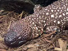 The Mexican beaded lizard (Heloderma horridum) is a species of lizard in the family Helodermatidae, one of the two species of venomous beaded lizards found principally in Mexico and southern Guatemala. It and the other members of the same genus, including the Gila monster (Heloderma suspectum), are the only lizards known to have evolved an overt venom delivery system. The Mexican beaded lizard is larger than the Gila monster, with duller coloration, black with yellowish bands. As it is a specialized predator that feeds primarily upon eggs, the primary use of its venom is still a source of debate among scientists. This venom has been found to contain several enzymes useful for manufacturing drugs in the treatment of diabetes, and research on the pharmacological use of its venom is ongoing.