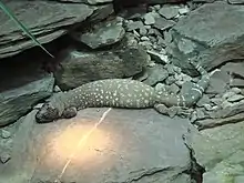 The beaded lizard is a specialized vertebrate nest predator, feeding primarily on bird and reptile eggs. A semiarboreal species, it is found climbing deciduous trees in search of prey when encountered above ground.[15] It occasionally preys upon small birds, mammals, frogs, lizards, and insects. Steve Angeli and Robert Applegate, noted captive breeders of the beaded lizard, have remarked that captive specimens do best on a diet of small vertebrates such as mice and rats. Confiscated wild-caught specimens can be made to feed by using egg on the prey item.[12][16]