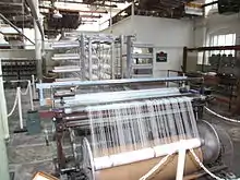 In early days beaming was often done in the weaving shed but later the process tended to be transferred to the spinning mill.[2] The spinners would send lorries loaded with of beams wound with thread of the ordered specification[lower-alpha 1] to the weavers. Several tapers beams would be attached to creels on the Tape Sizing machine, and the threads from these would be sized and combined to create the smaller weavers beams.[3] As a rule of thumb, a tapers beam had thread long enough to make 20 weavers beams.