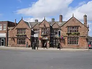 According to the date on the lintel over the front door, the Bear's Paw was constructed in 1632. It was built on land owned by the Savages of Rocksavage, who were lords of the manor. The original name was the 'Lyon's Paw', this being based on an animal's paw on the arms of the Savage family. In 1697 Earl Rivers of the Savage family reverted to Roman Catholicism and, following the outcry resulting from this, the name was changed to the 'Bear's Paw'.[2] In the 18th century its title was the 'Bears Paw Hotel and Posting House'; Royal Mail coaches called there when travelling between Chester, Warrington and Manchester. When the Lancashire, Cheshire and Birkenhead Railway opened in 1850, Frodsham station was near the hotel and 'Railway Hotel' was added to its title. In 1903–04 the front and side of the building were restored by the Chester firm of architects Douglas and Minshull.[2]