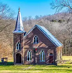 The church building is a brick structure in a vernacular Victorian design.[3] It was built in 1897 and dedicated in 1898.[3] It was added to the National Register of Historic Places in 1985.[1] The church is privately owned and has been vandalized several times. After this last vandalism the church lost several of its historic windows. Alarms are being installed. It is not open to the public. Vandals will be prosecuted to the fullest extent of the law.