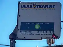 Bear Transit is the bus service operated by the Department of Parking and Transportation of the University of California, Berkeley.[1] Its fleet includes a combination of shuttle vans and passenger buses (small and regular-sized), with all of its passenger buses formerly owned by AC Transit. In the early 2000s the passenger buses used were refurbished by AC Transit. Bear Transit connects various areas of the university, including student housing, the main campus, the Hill area, Downtown Berkeley (including Berkeley BART), and distant locations such as Lawrence Hall of Science in the East Bay Hills and the Clark Kerr Campus south of the main campus. It also provides shuttle service to the Richmond Field Station (RFS), a research facility also owned by the University, located in Richmond.