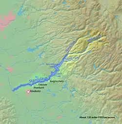 The earthen dam was completed in 1957 with a height of 284 feet (87 m), and a length of 1,000 feet (300 m) at its crest.[1] It impounds the Middle Fork of the Stanislaus River for hydroelectric power and irrigation water storage, part of the Stanislaus River Tri-Dam project cooperatively owned by the Oakdale Irrigation District and South San Joaquin Irrigation District.[2]