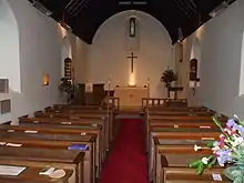 The head is pointed and of one square order, probably a later alteration. In the south wall is another blocked doorway with square pilaster-jambs and pointed head, perhaps of the 13th century but difficult to date. The two buttresses to each wall are medieval. The west wall and porch-tower are of red brick. The bell-cote is of wood. The main roof is tiled.[2] One of the three bells is medieval.[10] There is now a single bell by Wm Blews inscribed MARIA, fleur de Lys, Queen, King, fleur de lys MARIA that was made by re-casting two bells when the building was re-modelled in 1875.[11] The Millennium Window by Art of Glass, Earlswood (River of the Water of Life) 2001 donated by Audrey Payne in memory of her late husband.