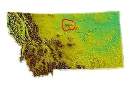 The Bears Paw Mountains (Bear Paw Mountains, Bear's Paw Mountains or Bearpaw Mountains)[2] are an insular-montane island range in the Central Montana Alkalic Province in north-central Montana, United States, located approximately 10 miles south of Havre, Montana. Baldy Mountain, which rises 6,916 feet (2,108 m) above sea level, is the highest peak in the range. The Bears Paw Mountains extend in a 45-mile arc between the Missouri River and Rocky Boy Indian Reservation south of Havre.