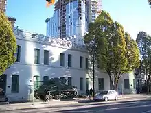 The building was designed by architect T.W. Fuller and opened on 30 September 1901 by the Duke of Cornwall (later King George V). With two large castle-like turrets complete with battlements, and two tanks and a 64-pounder Gun alongside the large white structure, Beatty Street Drill Hall has long been a Vancouver landmark and is listed as a class-A heritage building.[2][3] The walls are three and a half feet thick, and the building rests on huge granite blocks. Limestone from Gabriola Island was used for the parapet and it features a rusticated stone trim.[4]