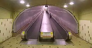 Designed by Adalbert Niklewicz, it is a normal side platform station, built in-tunnel; a transept leads to a long inclined moving sidewalk, the only one of its kind in the Metro, traversing the distance between De Maisonneuve Boulevard and Saint Catherine Street, on which the entrance is located. The moving sidewalk has been a burden to the STM because it is unique and so replacement parts must be custom-built.