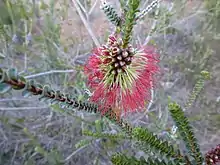 Plants in the genus Beaufortia, sometimes commonly known as bottlebrush are evergreen shrubs with very small, glandular, aromatic leaves usually oppositely arranged. The tallest are up to 3 m (10 ft) in height. Most are andromonoecious, meaning they have both male and bisexual flowers on one plant. The flowers are in spikelike or headlike inflorescences. The flower has five triangular sepals and five white, yellow, red, pink, or purple petals, which are sometimes hairy. The petals usually fall off as the flower opens, or shortly after that. The stamens are red or deep pink, arranged in five bundles and extend well beyond the petals, giving the inflorescence its colour. Unlike other closely related genera such as Melaleuca, the anthers are attached to the filament at their base and release their pollen through two curved slits on the other end. Flowering in most species occurs throughout the year but mostly between late spring and autumn. The fruit is a dehiscent capsule with three valves, each holding a winged seed.[5][6][7]