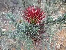 The flowers are red, arranged in dense heads about 25 mm (0.98 in) in diameter on the ends of the branches and are surrounded by long soft hairs. The flowers have 5 sepals, 5 petals and 5 bundles of stamens. The stamens give the flowers their colour and are in bundles of 3, joined for most of their length, the bundles of different lengths. Flowering occurs from August to December and is followed by fruit that are woody capsules.[2][3][4]