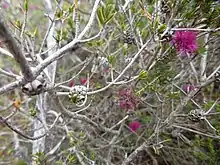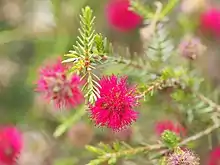 The flowers are purple or purplish red and are arranged in bottlebrush-like spikes on the ends of branches which continue to grow after flowering. The flowering part of the stem is densely hairy and the flowers have 5 sepals, 5 petals and 5 bundles of stamens. The stamen bundles, which give the flowers their colour contain 3 to 7 (usually 5) stamens which are joined for about half their length. Flowering occurs from October to December or in January to February and is followed by fruit which are woody capsules in clusters about 12 mm (0.47 in) long .[2][3][4]