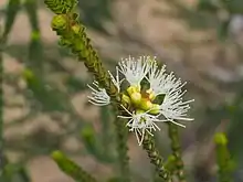Beaufortia sprengelioides is a rigid, spreading shrub which grows to a height of about 2 metres (7 ft). The leaves are crowded and mostly arranged in alternate pairs (decussate), so that, especially on the younger branches, they make four rows along the stems. The leaves are flat or slightly dished, broadly egg-shaped to round, 2–3 millimetres (0.08–0.1 in) long and have 3 veins, not including the marginal veins.[2][3]