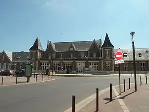 Beauvais is a railway station located in Beauvais in the Oise department, France. TER Hauts-de-France trains connect the station to Le Tréport-Mers, Creil and Paris-Nord.[1] The Neo-medieval station building was constructed by Compagnie du Nord in brick and concrete in 1860.[2] The line to Paris is electrified with an alternating current running 25 kV-50 Hz. Other lines run on diesel.