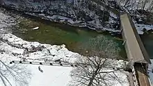 It is a 98-foot (30 m) hemlock lattice truss bridge supported by dry-laid fieldstone abutments faced in concrete at either end. On the east a ten-foot (3 m) approach ramp supported by a steel I-beam[4] leads up slightly to the portal past a rustic wooden fence along either side of the road that becomes timber guide rails. A plank deck 13 feet (4.0 m) wide is supported by eight irregularly spaced stringers atop 8-by-14-inch (20 by 36 cm) wood planks. Four of the cross beams extend beyond the bridge where they connect to the upper chord via sway braces. On either side vertical board-and-batten siding begins a foot below the lower chord and rises to a gabled metal roof, 11+1⁄2 feet (3.5 m) high, supported by tie-beam rafters with transverse metal rods and diagonal cross-bracing.[4] Interior clearance is only 6+1⁄2 feet (2.0 m), enforced by metal height restrictors near the portals.[3]