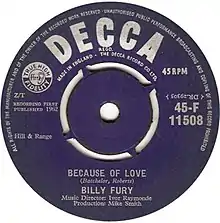 Whilst Presley was the first to record "Because of Love", it was first released by English singer Billy Fury in October 1962 as a single. It peaked at number 18 on the Record Retailer Top 50.[4]