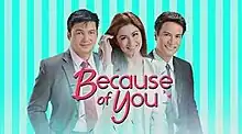 Because of You is a Philippine television drama romantic comedy series broadcast by GMA Network. Directed by Mark A. Reyes and Ricky Davao, it stars Carla Abellana, Rafael Rosell and Gabby Concepcion. It premiered on November 30, 2015 on the network's Telebabad line up replacing Beautiful Strangers. The series concluded on May 13, 2016 with a total of 117 episodes. It was replaced by Juan Happy Love Story in its timeslot.