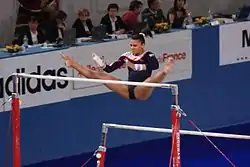 In March, Downie placed fourth at the American Cup in Chicago with a score of 55.600.[12] The following month, she competed at the 2009 European Championships in Milan, where she placed eleventh in the all-around final (55.075) and sixth on vault (14.025) and uneven bars (14.525).[13]