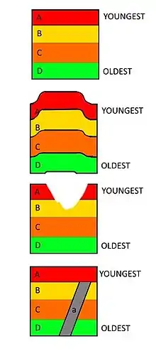 Vertical cross-sections of bed sequences to illustrate (from top to bottom) the Law of Superposition, the Law of Original Horizontality, the Law of Lateral Continuity, and Cross-Cutting Relationship