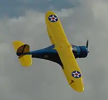 The Beechcraft Model 17 Staggerwing is an American biplane with an atypical negative wing stagger (the lower wing is farther forward than the upper wing). It first flew in 1932.