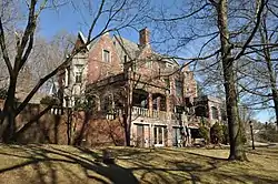 The estate includes an imposing brick mansion and a large support building set among scenic landscaping. The mansion was originally built in about 1875 in a Victorian Gothic style, and was extensively remodeled in the 1920s in the Tudor Revival style. It is a large, 2+1⁄2-story, asymmetrical brick building with stone trim, Tudor arches, and plain balustrades. The north elevation retains the original 1+1⁄2-story, red brick walls with polychrome brick trim. The large support structure has a two-story center section, flanked by 1+1⁄2-story wings, and is in the Jacobean Revival style. The property was originally developed by Rev. Henry Ward Beecher (1813-1887), then purchased by the locally prominent McFadden family in 1902.[2]