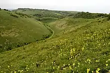 Three areas of the SSSI are to the east of the Saddlescombe Road in the Newtimber parish. The Newtimber Hill area (area eleven) itself is a chalk grassland area in favourable condition with dwarf thistle, fairy flax, bird's foot trefoil and rough hawkbit.[1] One can find tiny frog orchids and a funny late-flowering form of burnt-tip orchids in the area There is a ribbon of tormentil where the chalky slopes break to meet the acidic plateau top. There are anthills, cattle terracettes and some years dark green fritillary, the rare silver-spotted skipper butterfly and a big populations of glowworm.[9]