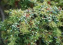 On the west flank of Newtimber Hill (area thirteen), above and below the Saddlescombe Road, are disused braided trackways, that are known locally as the ‘Devil's Stairs’. In this area lives a population of ancient juniper, our most special and rarest native bushy species. Some of the bushes may be as old as four hundred years, despite being only ten metres (thirty foot) or so high. The bushes' ancestors are likely some of the first woody species re-colonizing postglacial Britain, as it is a classic species of the cold tundra grasslands. Unfortunately, the Newtimber junipers are the only native ones on the Brighton Downs, despite Wolley-Dod in 1937 recording it as being abundant to the west of Brighton and present if rare to the east.[11] The National Trust and the Sussex Wildlife Trust are now bravely restoring the juniper's old Down pasture habitat and it is being planted on the A27 bypass at Stanmer and Devil's Dyke.[9]