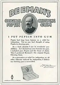 Beemans gum (originally Beeman's Gum, see image at right) is a chewing gum formulated by Ohio physician Edward E. Beeman in the late 19th century. It originally contained pepsin, but no longer does.