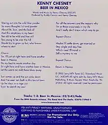 "Beer In Mexico" is a song written and recorded by American country music artist Kenny Chesney. It was released in January 2007 as the fifth and final single from his 2005 album The Road and the Radio. The song reached number one on the U.S. Billboard Hot Country Songs chart. This was the first song written by Kenny Chesney himself to reach the top of that chart.