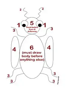 It is necessary to roll the correct number for the body before any other part may be drawn. To the body, one may attach the head, legs or wings, but the head must precede the antenna and eyes. The first player to draw all the requisite parts is the winner.