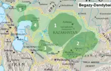 Begazy-Dandybai culture is a late Bronze Age culture of mixed economy in the territory of ancient central Kazakhstan, Kyrgyzstan, and Uzbekistan, that flourished from 13th to 10th centuries BCE,[1][2] centered at Saryarka region. The culture, with its megalithic mausolea was previously dated between the 12th and 8th centuries BCE.[3] The culture was discovered, first excavated, and published in the 1930s-1940s by M.P. Gryaznov, who took it for a local version of Karasuk culture. In 1979 the Begazy-Dandybai culture was described and analyzed in detail in a monograph by A.Kh. Margulan, who systematically reviewed accumulated material and produced description of the archeological culture.[4] The most famous monuments of Begazy-Dandybai culture are Begazy, Dandybai, Aksu Ayuly 2, Akkoytas, and Sangria 1.3, it was named after the first two archeological sites.