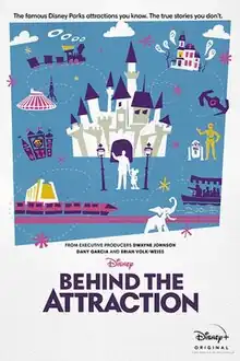 Behind the Attraction is a documentary TV series by Brian Volk-Weiss for Disney+ produced by Dwayne Johnson's Seven Bucks Productions and Volk-Weiss's The Nacelle Company.[2] The first five episodes were released on July 21, 2021, with the remaining five being released on August 25 of that same year.[3] The documentary is narrated by Paget Brewster.[4][5]
