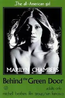 Behind the Green Door is a 1972 American feature-length pornographic film, widely considered one of the genre's "classic" pictures and one of the films that ushered in The Golden Age of Porn (1969–1984).[2][3][4][5] Featuring Marilyn Chambers, who became a mainstream celebrity, it was one of the first hardcore films widely released in the United States and the first feature-length film directed by the Mitchell brothers.[6] It was adapted from an anonymous short story of the same title, which was circulated by means of numerous carbon copies. The story's title makes reference to the 1956 hit song "Green Door", whose lyrics describe being denied entry to a raucous nightclub with a green door.[7] Though she plays the film's central character, Chambers does not have a single word of dialogue in the entire film. The film is possibly the first U.S. feature-length heterosexual hardcore film to include an interracial sex scene.[8]