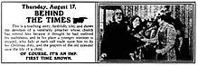 Behind the Times is a 1911 short film by Thomas H. Ince with Owen Moore, Ethel Grandin, and Lucille Young.[1] According to a contemporary newspaper, the story is about the conflict between an old priest who is asked to retire and a young priest who can't do the job properly.[2]