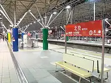 The two-level, elevated station structure with one island platform and two side platforms. The washrooms are inside the entrance area.[2] There are several amenities around the station. This include Beitou Presbyterian Church and Beitou Market.