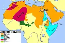 Many of the Beja speak Arabic, while some speak the Beja language,[1] known as Bidhaawyeet or Tubdhaawi in that language. It belongs to the Cushitic branch of the Afroasiatic family.[19] Cohen noted that the Beja language is the Cushitic language with the largest proportion of Semitic roots, and stated that they are in majority of Arabic origin.[20]