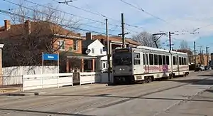 Belasco is a station on Pittsburgh Regional Transit's light rail network, located in the Beechview neighborhood of Pittsburgh, Pennsylvania. The street level stop is located on a small island platform in the middle of Broadway Avenue, through which The T travels along former streetcar tracks. The station serves a densely populated residential area through which bus service is limited because of the hilly terrain.