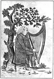 The 1792 Harpers's Festival had been organised, again, by members of the Belfast Society for Promoting Knowledge (known then as the Belfast Reading Society): James MacDonnell, Henry Joy, Robert Bradshaw and Robert Simms.[5] Encouraged by MacDonnell and supported by his adoptive family, McCrackens, the musician and collector Edward (Atty) Bunting notated the music of the ten performers. In 1808, he was appointed musical director of the new society, with Mary Ann McCracken acting informally as his secretary.[6] Bunting's master tutor was the most celebrated of the 1792 performers, Arthur O'Neill of Dungannon, now 75. O'Neill was to instruct poor children from the age of ten, blind like himself, with a view both to preserving his musical legacy and, as harpists, to save his charges from a life of destitution.