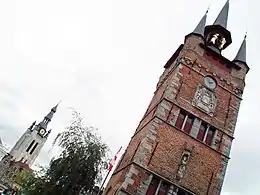 The Belfry of Kortrijk (Dutch: Belfort van Kortrijk) is a medieval bell tower in the historical centre of Kortrijk, Belgium. One of the city's most prominent symbols, the belfry formerly housed a treasury and the municipal archives, and served as an observation post for spotting fires and other danger. A narrow, steep staircase, accessible by the public without any entry fee, leads to the top of the building, which nowadays leans about a bit to the west. In 1999, the belfry was inscribed on the UNESCO World Heritage List as part of the Belfries of Belgium and France site, in recognition of the civil, not religious, importance and architecture of the belfries in the region.[1]
