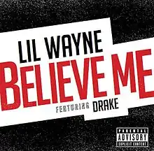 "Believe Me" is a song by American rapper Lil Wayne. It was serviced to urban contemporary radio stations on May 6, 2014, in the United States and was released as a digital download on May 28, 2014.[1] The song features a guest appearance by Canadian rapper Drake.[2] It was released as the intended lead single from Wayne's twelfth studio album, Tha Carter V, however the song was omitted from the tracklist upon the album's delayed release in September 2018.