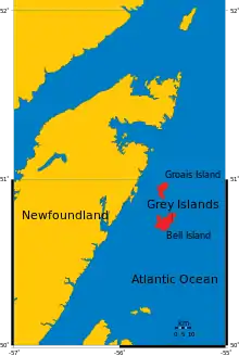 Bell Island is one of the Grey Islands, located off Newfoundland's Great Northern Peninsula to the east in the Atlantic Ocean. With an area of 88 km2. The island is hilly, rising to over 152 m. (500 ft). The village of Grey Islands Harbour is situated at the southern end of the island. [1]