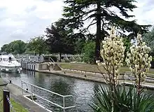 Bell Weir Lock is a lock on the River Thames in England by the right bank, Runnymede which is a water meadow associated with Egham of importance for the constitutional Magna Carta. It is upstream of the terrace of a hotel and the a bridge designed by Edwin Lutyens who designed an ornamental park gate house along the reach. The bridge has been widened and carries the M25 and A30 road across the river in a single span. The lock was first built by the Thames Navigation Commission in 1817; it has one weir which is upstream. The lock is the eighth lowest of forty-five on the river and is named after the founder of the forerunner of the adjoining hotel who took charge of the lock and weir on its construction.