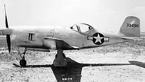 On 16 May 1942, the USAAF recommended the construction and testing of 25 XP-77s.[1] The aircraft featured a single-engine, low-wing monoplane with mainly wood construction, equipped with tricycle landing gear, a typical Bell feature that bestowed good ground handling. A bubble canopy also provided fair visibility except in the forward-downward direction due to the extended nose.[2]