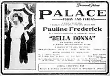 Bella Donna was a 1915 American silent drama film produced by Famous Players-Lasky and the Charles Frohman Company, starring Pauline Frederick, and based on the 1912 play Bella Donna by James Bernard Fagan adapted from the 1909 novel of the same name by Robert Smythe Hichens.[1]