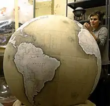 Originally made from hemispheres of plaster of Paris glued together,[18] the company's small globes are now made from resin and the larger from composite materials.[19] The company employs three cartographers and uses a modern map of their own design that customers are invited to customise. The maps are printed onto paper gores and cut by hand. The paper is wet and stretched across the sphere before being hand painted and finished with a matte or gloss finish.[19] The globes are weighted so they come slowly to rest when spun.[18]