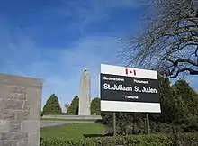 The village of St. Julien (now Sint-Juliaan; 50.890°N 2.937°E) was in the rear of the 1st Canadian Division until the poison-gas attack of 22 April, when it became the front line. Some of the first fighting in the village involved the stand of lance corporal Frederick Fisher of the 13th Battalion CEF's machine-gun detachment; Fisher went out twice with a handful of men and a Colt machine gun, preventing advancing German troops from passing through St. Julien into the rear of the Canadian front line. He was killed the following day.[14]