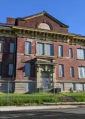 The building has an intact exterior, with original brick walls, limestone trim, and a slate roof. The building still retains original wood window sashes and some doors. While vacant, the building has had corrugated metal coverings to discourage trespassing. The building has never had any additions made to it.[3]
