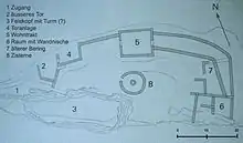 The castle was built near the, now abandoned and vanished, Walser village of Fidaz near Flims. It was built on a rocky spire with sheer cliffs on the north and east sides. Very little is known about the construction history and layout of the castle. However, there were two semi-circular ring wall that wrapped around the east, north and north-west sides of the peak with the inner one built first followed by the outer later. The walls connected at least three buildings. The central and eastern building were probably residences. In the center of the half-circle is a 5.7 meters (19 ft) deep cistern. On the southern side of the castle is a smaller rocky peak that stands about 8 m (26 ft) above the castle and has a flat top that is about 10 m × 30 m (33 ft × 98 ft). No stone ruins have been found on the small peak, so it was probably topped with one or more wooden buildings.[2]