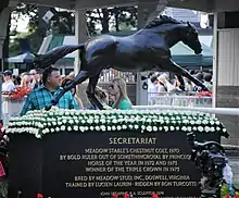 Secretariat's finishing time in his 1973 Belmont victory (2 minutes, 24 seconds) set a world record for 1+1⁄2 miles (2.4 km) on dirt,[23] a world record which still stands. The 31-length victory clinched the first Triple Crown in 25 years, dating back to Citation in 1948. A statue of Secretariat is in the center of the Belmont paddock.