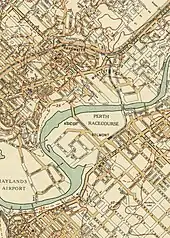 In November 1885 a 65 chains (1.3 km) branch line was constructed from the Eastern Railway at Bayswater to the Swan River near the Perth Race Course, improving access to the Race Course.[3] Initially a ferry service across the Swan River was provided for racegoers travelling to and from the Race Course by train,[4] which was replaced by a narrow footbridge by 1891.[5]