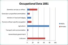 The most common occupational area of the time was agriculture. This is more than likely due to the surroundings of Belton; the parish has vast surroundings of arable land still used today. This factor, along with the fact that jobs today may not have existed back then, meant there was a limited number of professions to go into. Agriculture, unsurprisingly, was dominated by males at the time, whereas many of the women's occupation were unknown, or in domestic services.[8]